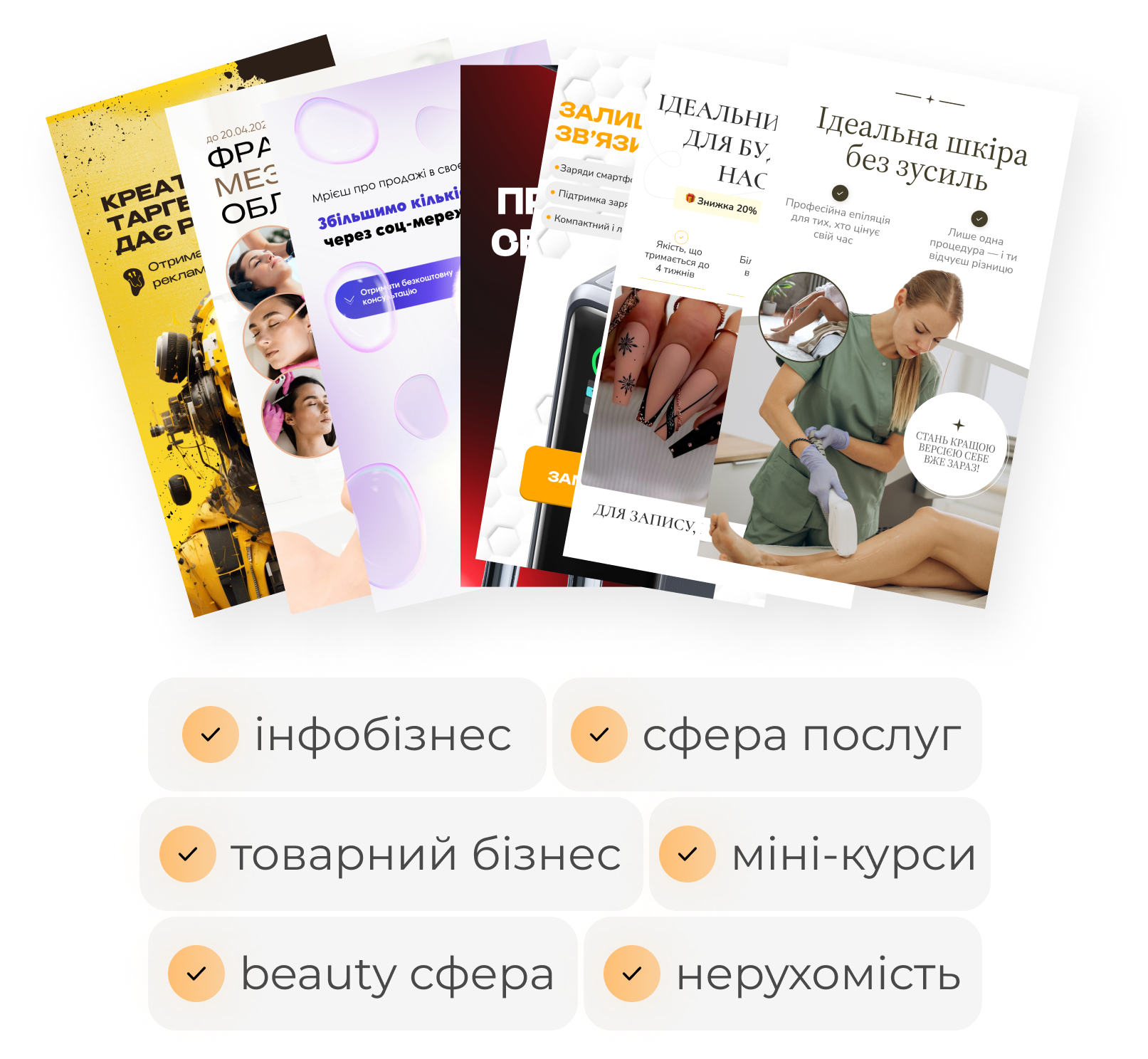 Для інфобізнесу, міні курсів, товарки, beauty, нерухомості, ремонтів, доставок харчування та сфери послуг